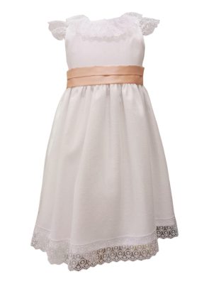 O vestido de cerimónia “Tull de Pintas” é confecionado em tule, cetim raso e algodão. Este vestido apresenta detalhes de renda no decote, mangas e saia. Com fecho nas costas e forro em algodão, este vestido oferece a possibilidade de escolher a cor da faixa. Uma opção encantadora para ocasiões especiais!